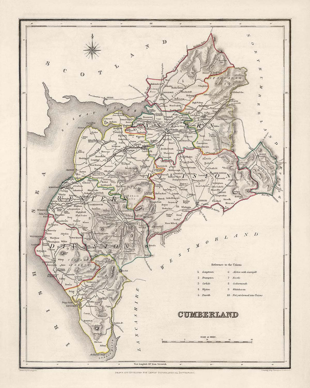Ancienne carte de Cumberland par Samuel Lewis, 1844 : Carlisle, Whitehaven, Workington, Penrith et Keswick