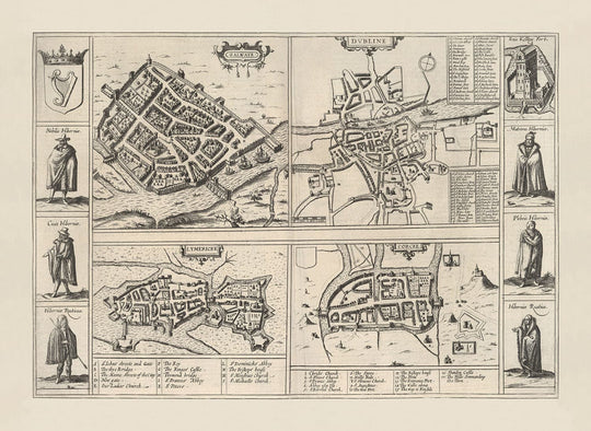 Publié en 1618 par Georg Braun et Frans Hogenberg, ceci est l'une des premières cartes imprimées des villes irlandaises de Dublin, Limerick, Cork et Galway. Si Shakespeare avait visité l'Irlande à l'époque, c'est à quoi ces villes auraient ressemblé. Cette carte a été publiée pour la première fois dans Civitates Orbis Terrarum - les Villes du Monde - qui était un chef-d'œuvre cartographique comportant 546 cartes.
