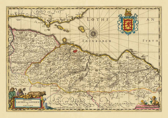 Le coin supérieur droit de la carte montre un blason écossais merveilleusement illuminé. Le firth de Forth domine la partie supérieure de la carte et Inverkeithing juste de l'autre côté de la rivière peut être vu.