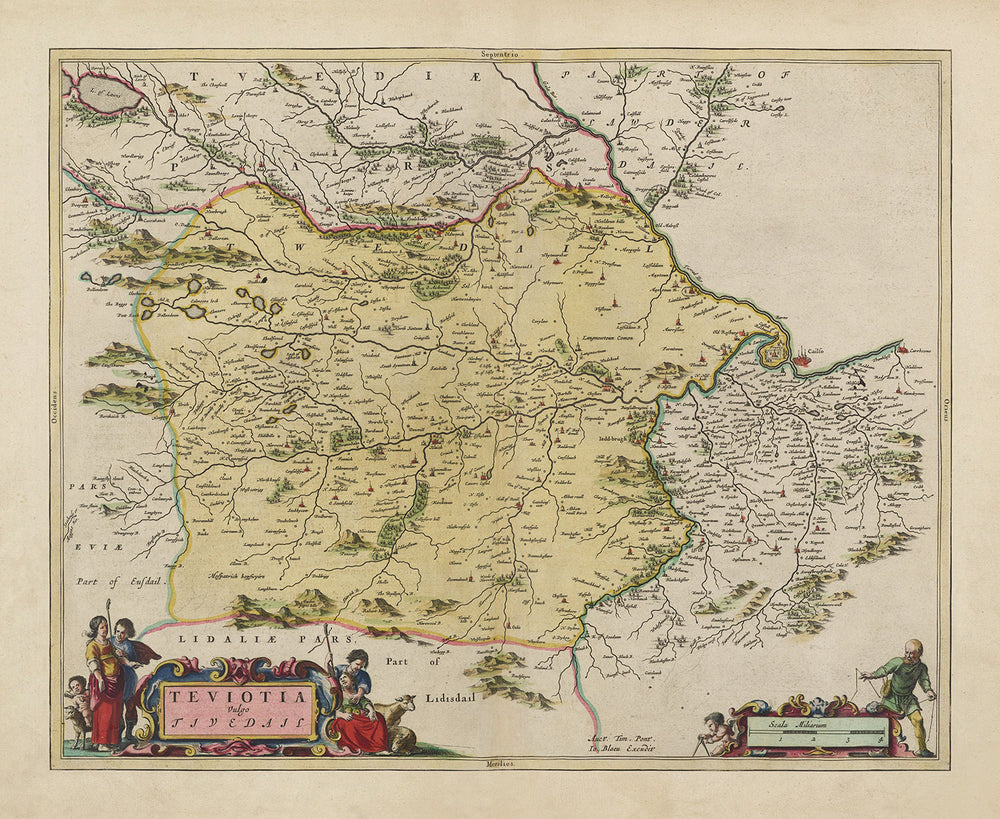 Cette carte ancienne en couleur, extrêmement rare, du comté de Roxburgh en Écosse a été créée par le maître cartographe Joan Blaeu depuis son atelier à Amsterdam et publiée à l'origine en 1665 dans son Theatrum Orbis Terrarum Sive Atlas Novus.