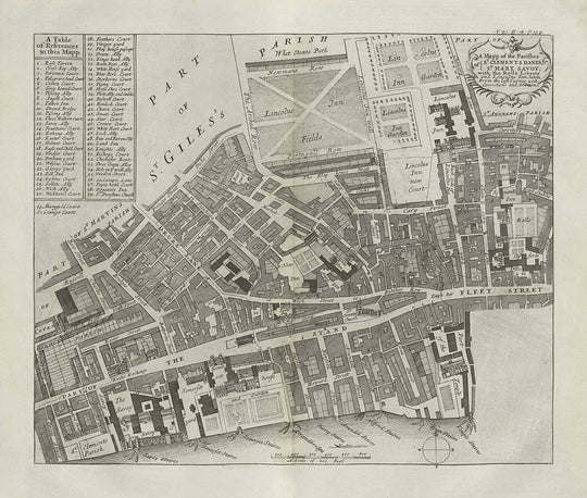 Cette carte d'enquête se concentre principalement sur les paroisses de St Mary Savoy et de St Clement Dane dans le borough de Holborn, où vous pouvez voir Lincoln Inn Fields ainsi que la rivière Thames en bas de la carte. Vous pouvez déjà voir The Savoy en bas à gauche de la carte, qui à l'époque était un manoir et une liberté.