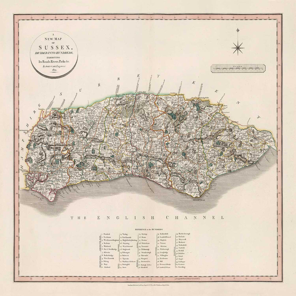 Cette magnifique carte ancienne du Sussex a été publiée en 1801. Elle a été créée par John Cary.