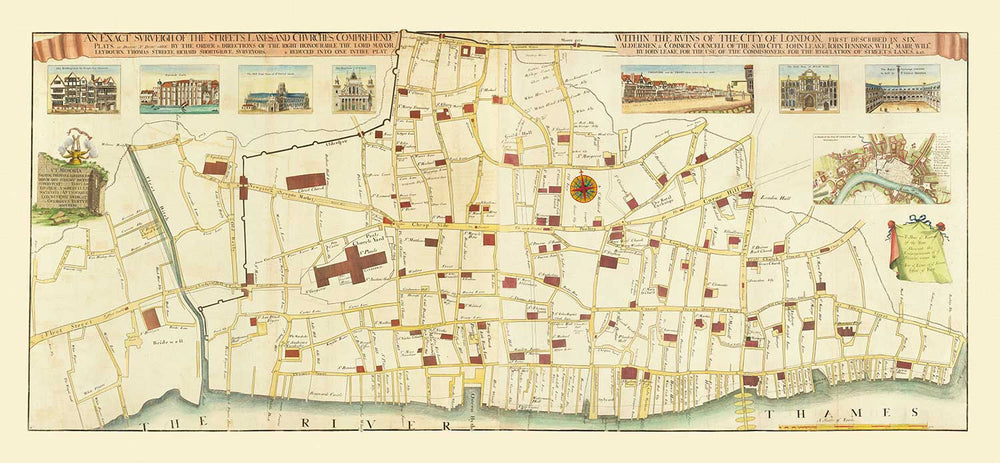 La carte comprend également les principaux points de repère de l'époque, tels que la cathédrale Saint-Paul et la Tour de Londres. Ces points de repère étaient des symboles importants de la résilience de la ville et ont joué un rôle déterminant dans les efforts de reconstruction de la ville. Aujourd'hui, la carte est une ressource précieuse pour les historiens et les architectes qui étudient l'histoire et le développement de la ville. Elle donne un aperçu unique de la dévastation causée par le Grand Incendie et des efforts déployés pour reconstruire la ville par la suite.