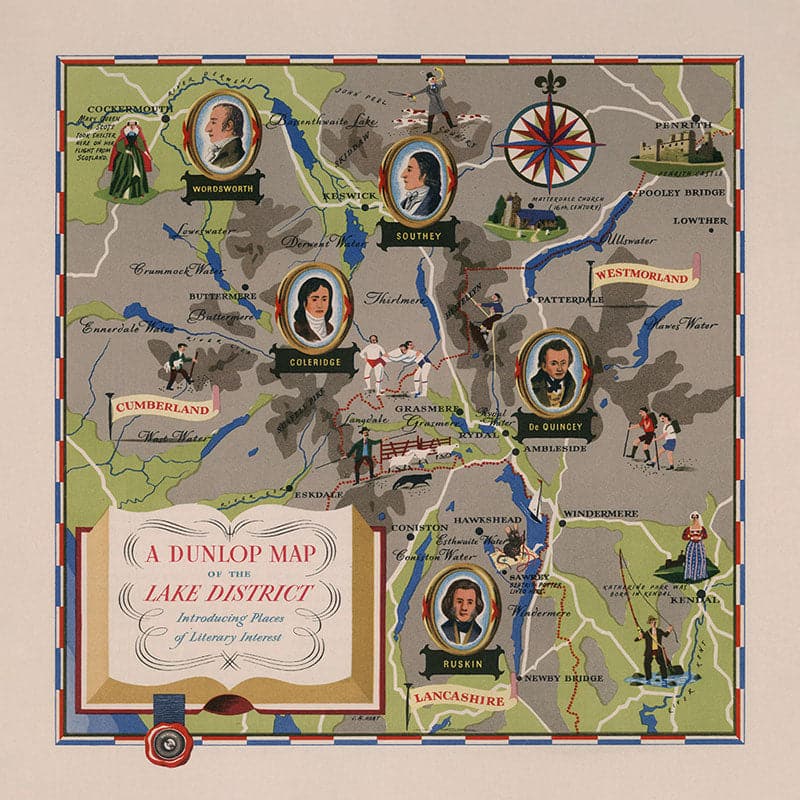 Un peu inhabituellement, cette carte est parsemée de silhouettes et de portraits de personnes célèbres et d'auteurs, tels que Wordsworth et Ruskin, et un marqueur d'où Mary Queen of Scots a pris un abri sur son vol de Scotland '.