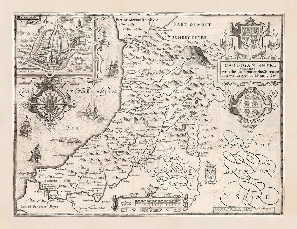 De nombreuses villes, villages et cités de Ceredigion sont déjà visibles sur cette carte : Cardigan, Aberporth (Aberporthe), Aberystwyth, Tregaron, Lampeter (Llanbeder) et Newcastle Emlyn.