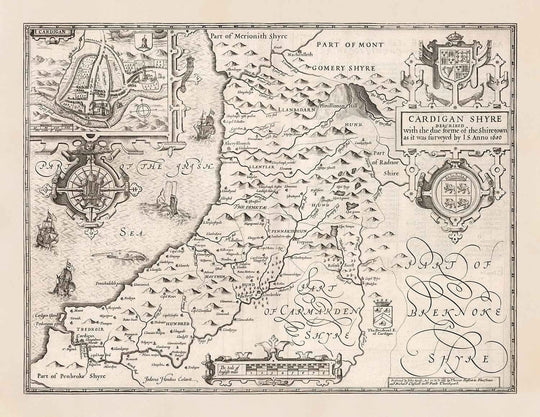 Cette vieille carte monochrome et merveilleuse montre le comté ancien de Cardiganshire (maintenant Ceredigion), au Pays de Galles en 1611. Elle a été créée par John Speed et gravée par Jodocus Hondius, et publiée à l'origine dans "The Theatre of the Empire of Great Britaine" de Speed.