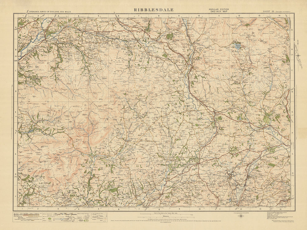 Cette carte ancienne, intitulée "Sheet 25 - Ribblesdale", est une pièce captivante de l'édition "populaire" d'un pouce de l'Ordnance Survey, Angleterre et Pays de Galles, publiée en 1925. La carte présente le comté historique de Ribblesdale, situé dans la région pittoresque du nord de l'Angleterre. Elle offre un aperçu fascinant du passé, présentant une multitude de villes et d'éléments remarquables de l'époque.