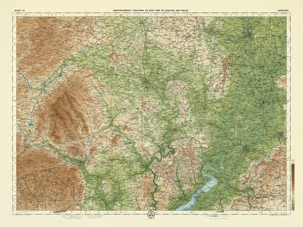 "Feuille 23 - Hereford," créée par le cartographe réputé JG Bartholomew en 1901, est un chef-d'œuvre de la cartographie du début du XXe siècle. Bartholomew, connu pour ses cartes innovantes et détaillées, a conçu cette carte au 1:126,720 (une demi-pouce pour un mile) en pensant aux cyclistes et aux touristes. La clarté, l'attrait et les couleurs vives de la carte en ont fait une série phare pour Bartholomew, et elle reste un morceau précieux pour les collectionneurs et les passionnés d'histoire. Cette carte particulière offre une représentation politique et physique détaillée du Herefordshire et de ses régions environnantes, fournissant un aperçu du paysage et de l'infrastructure des îles britanniques il y a plus d'un siècle.