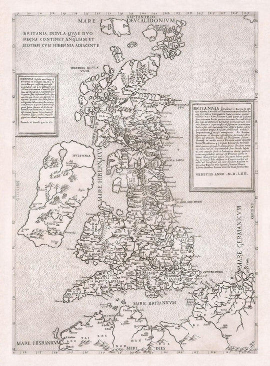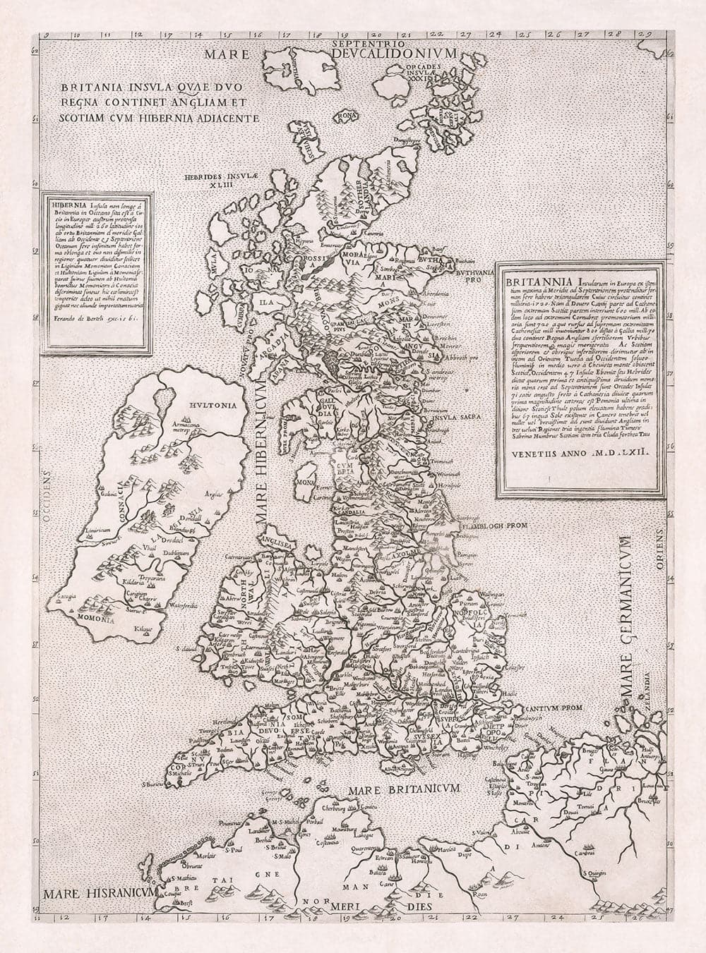 Les deux panneaux descriptifs encadrés donnent une description textuelle de l'Irlande et de la Grande-Bretagne ... mais écrit en latin, vous aurez peut-être besoin d'un dictionnaire pour les déchiffrer.