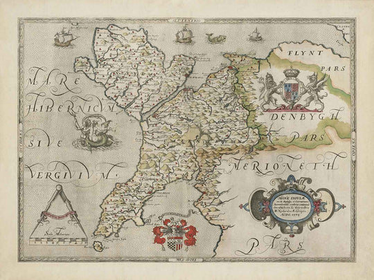 Créée il y a presque 450 ans, il s'agit de la première carte imprimée précise d'Anglesey et de Gwynedd. Elle a été publiée pour la première fois en 1577 par Christopher Saxton, le père de la cartographie britannique. C'est une belle carte ancienne, très détaillée et extrêmement rare..