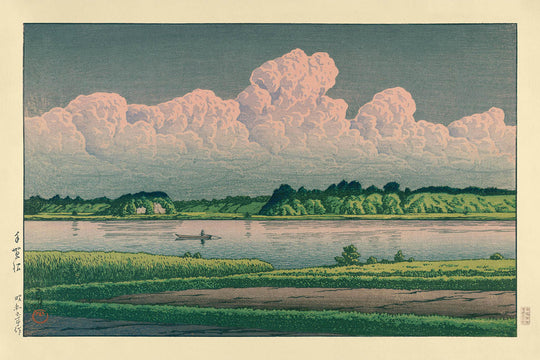 Nuages au-dessus d'un bateau sur la rivière par Hasui Kawase, 1935