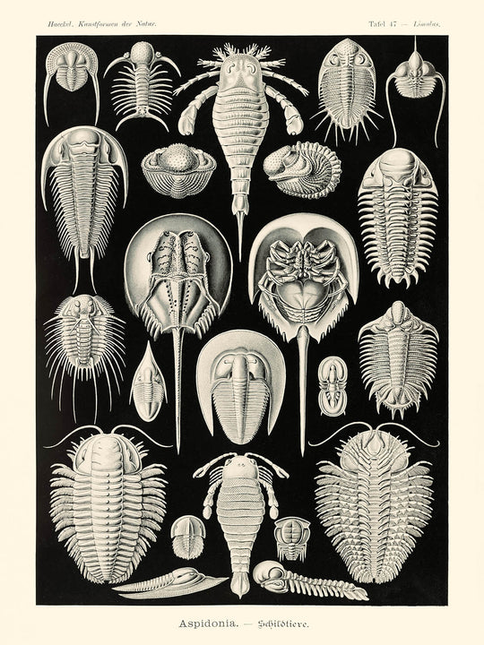 Aspidonia Schildtiere (Tafel 47), créé par le renommé Ernst Haeckel en 1904, est une illustration exquise qui met en valeur la beauté fascinante des crabes en fer à cheval de son célèbre "Kunstformen der Natur". Haeckel, pionnier à la fois en biologie et en art, a méticuleusement représenté ces créatures marines avec la plus grande attention aux détails, faisant de cette œuvre un véritable chef-d'œuvre scientifique et artistique.