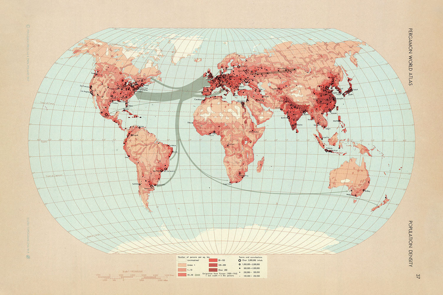 L’un des aspects les plus intrigants de cette carte est sa signification historique. Publiée en pleine guerre froide, la carte offre une perspective unique sur un monde divisé non seulement par des idéologies politiques, mais également par de fortes disparités en matière de densité de population. Les données visualisées sur cette carte constituent une ressource précieuse pour les historiens, les géographes et toute personne intéressée à comprendre la dynamique sociopolitique du milieu du XXe siècle. La représentation sur la carte de l'émigration européenne au cours de cette période est particulièrement remarquable, car elle reflète les profonds changements démographiques provoqués par des événements historiques majeurs tels que les guerres mondiales et le début de la guerre froide.