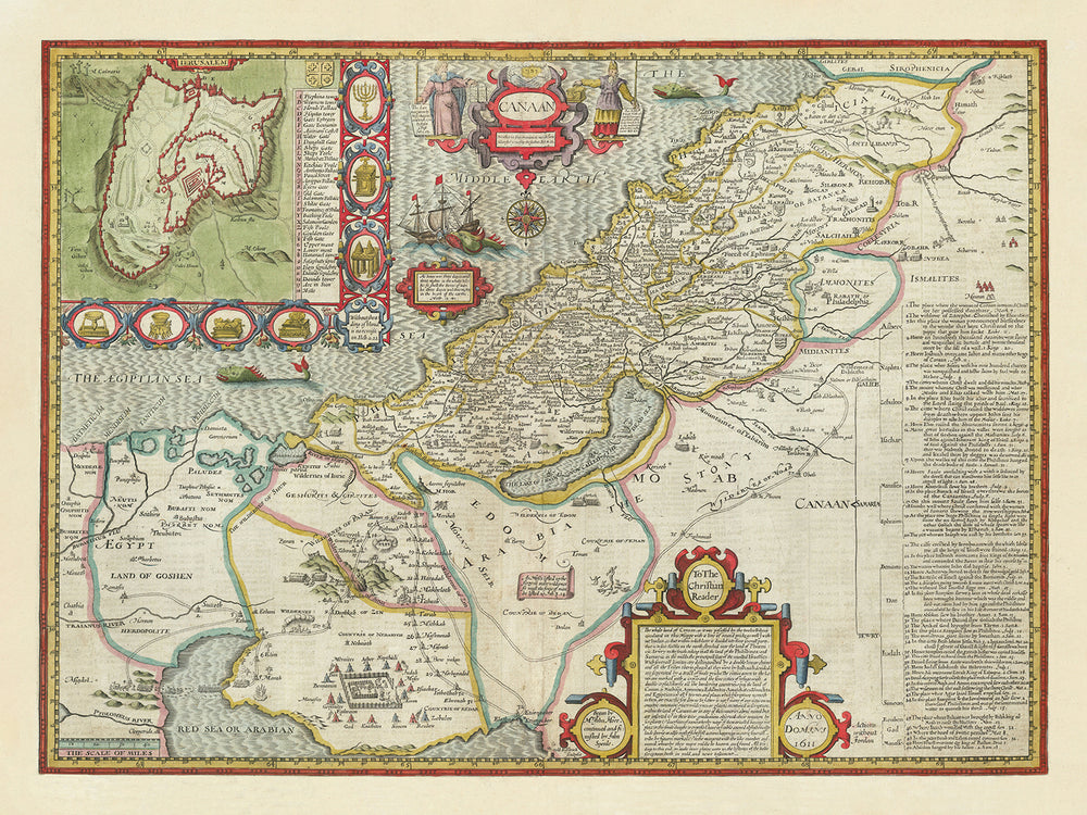Ancienne carte de Canaan (Terre Sainte) par John Speed, 1611 : Jérusalem, Bethléem, Nazareth, Samarie, Jéricho