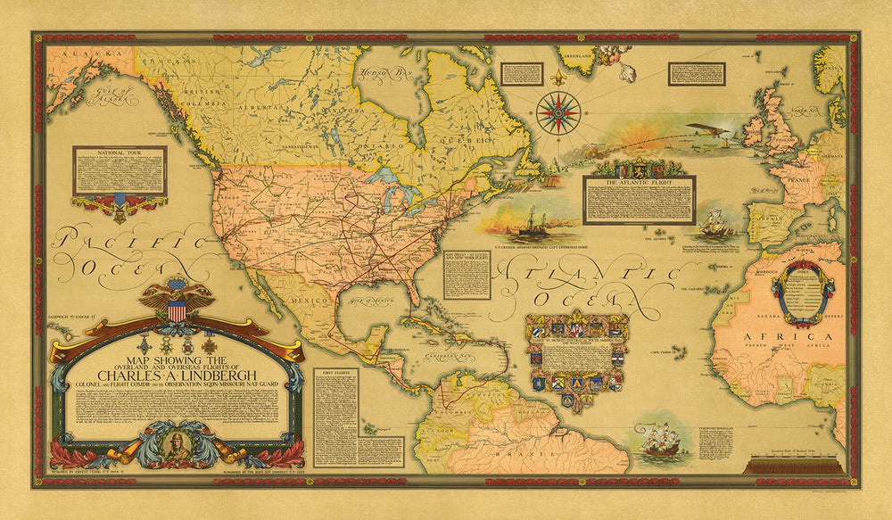 Cette carte est un délice thématique et pictural, mêlant des récits détaillés de la vie et des vols de Lindbergh à des éléments visuels époustouflants. L'inclusion du portrait de Lindbergh dans son équipement de vol emblématique ajoute une touche personnelle, tandis que les cartouches élaborées entourant les blocs de texte offrent une touche décorative qui renforce l'attrait esthétique de la carte. Chaque élément est judicieusement placé pour raconter une histoire, faisant de cette carte non seulement un outil de navigation mais aussi un document historique.