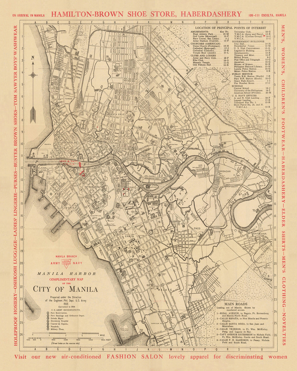 Ancienne carte de Manille par le YMCA et l'armée américaine, 1938 : Intramuros, Ermita, Quiapo, San Miguel, Binondo, Pandacan