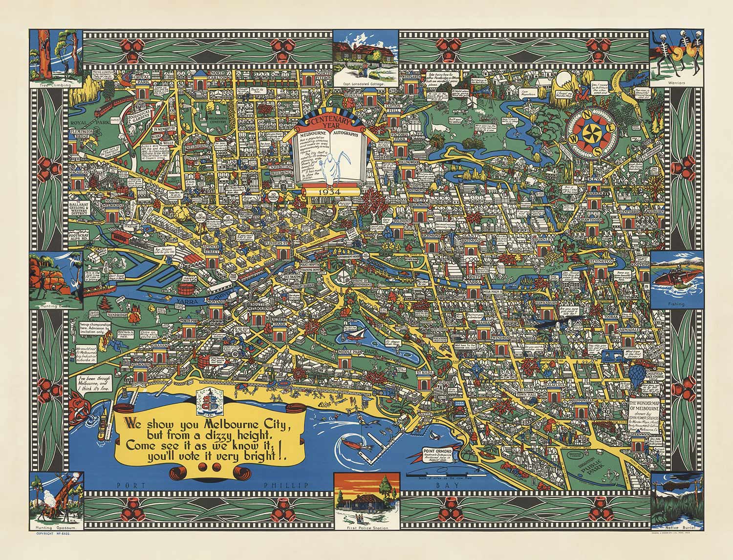 La carte donne une vue approximative de la ville depuis un point situé au-dessus de Port Philip, avec la plage et Beaconsfield Parade au premier plan. La carte couvre tout le centre-ville de Melbourne, d'Elsternwick à droite à Royal Park au nord.