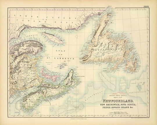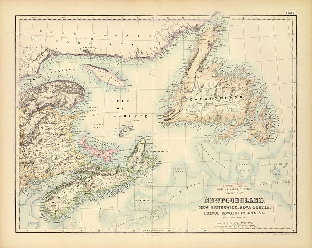 Ancienne carte de Terre-Neuve, Nouvelle-Écosse et Nouveau-Brunswick, 1872 par Fullarton: Canada, Amérique du Nord britannique coloniale