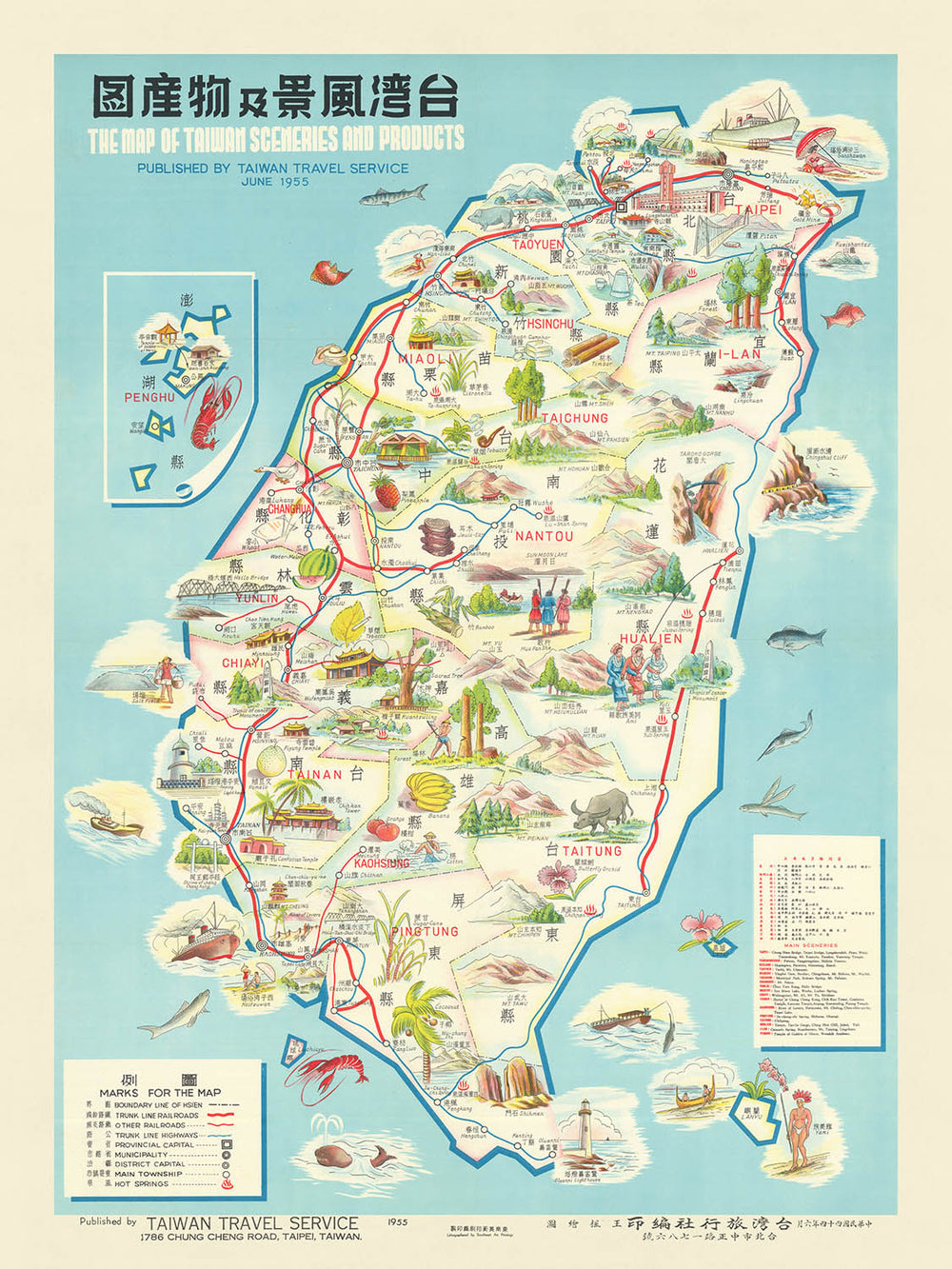 Ancienne carte picturale de Taiwan, 1955 : Taipei, lac Sun Moon, gorge de Taroko, tour Chih Kan, temple Confucius