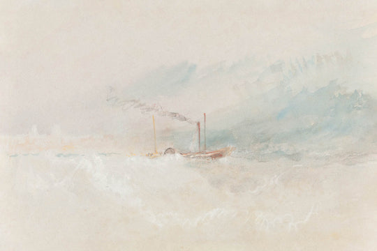 Turner, célébré comme l'un des artistes romantiques anglais les plus influents, était connu pour son utilisation innovante de la couleur et de la lumière. "Un bateau de courrier au large de Douvres" illustre la capacité de Turner à capturer l'interaction entre le ciel et la mer, mélangeant des teintes de blanc, de beige et de bleus profonds dans une composition à la fois vive et atmosphérique. Ses techniques pour dépeindre le mouvement des nuages et des vagues continuent de fasciner les amateurs d'art, faisant de cette impression un ajout précieux à toute collection.