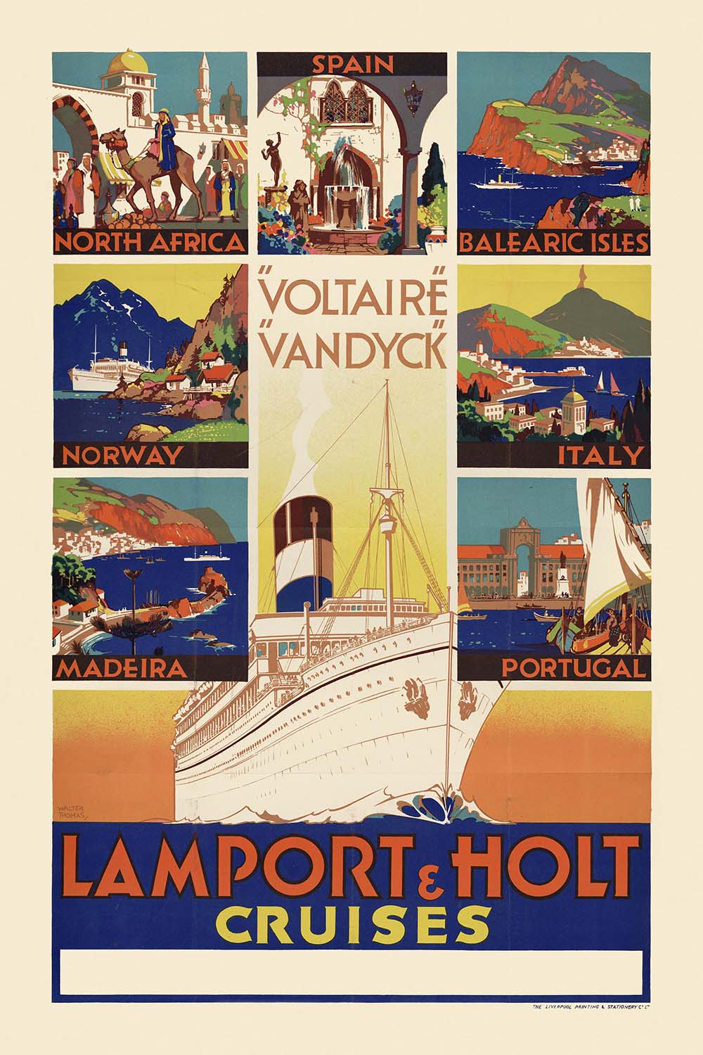 Lamport & Holt Cruises by Walter Thomas is a luminous celebration of the golden age of ocean travel. Created in the Art Deco tradition, this vintage poster invites the viewer aboard with a sleek, modern liner and a mosaic of stylized destination scenes arranged in crisp rectangular panels. The British line Lamport & Holt connected travelers with far-flung ports—particularly across the Atlantic and to South America—at a time when sea voyages embodied glamour, discovery, and the promise of sunshine abroad. Here, deep nautical blues meet warm oranges and sunlit yellows, while bold typography and the prominent ship names “Voltaire” and “Vandyck” evoke prestige and polish.