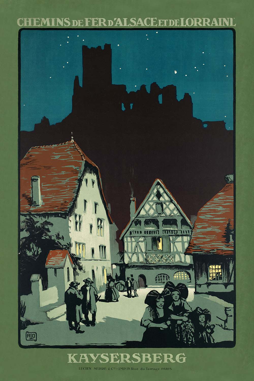 Though the designer is uncredited, the poster bears the hallmarks of early 20th-century railway advertising in Alsace, where elegant, silhouette-driven graphics and hand-rendered lettering elevated regional landmarks to icons. Kaysersberg, cradled between the Vosges foothills and vineyard-laced slopes, was a natural subject: its cobbled streets, half-timbered façades, and the castle on the Schlossberg formed a ready-made stage for romantic travel narratives.