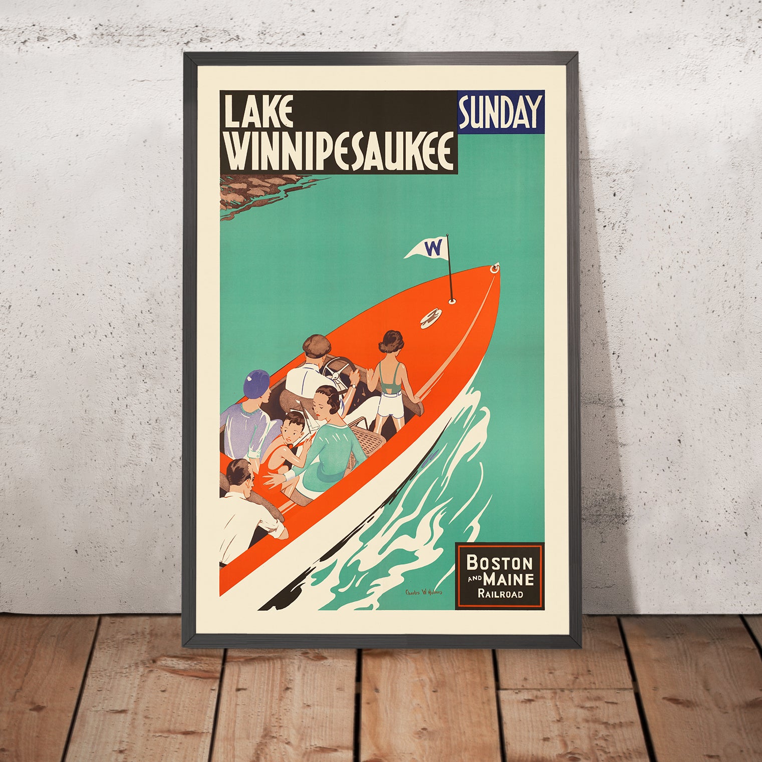 Design and color: Holmes deploys a harmonious palette where greens and turquoise-blues convey refreshing depth, while an orange-red boat slices forward like an exclamation point against the lake. Sunlit beiges warm the figures and highlights, balancing the cool water with human warmth. Clean, bold outlines and smooth, organic wave forms counterpoint the boat’s angular facets, creating a dynamic push-pull of motion and stability. The result is both graphic and lyrical: a poster that reads beautifully from across a room yet rewards close viewing with subtle tonal shifts and impeccable spacing. It’s an irresistible choice for anyone who loves Art Deco, vintage travel ephemera, classic boating culture, or the New Hampshire outdoors.
