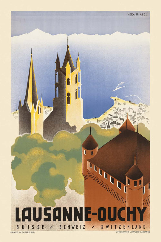Lausanne-Ouchy by Vera Hirzel is a luminous Art Deco travel poster celebrating the lakeside district of Lausanne on Lake Geneva (Lac Léman). In clean, modern shapes and a welcoming palette, the work distills the romance of Switzerland’s Vaud Riviera—sunlit quays, dignified architecture, and luxuriant greenery rising toward the city’s hilltop skyline. The design speaks to the golden age of European travel, when elegant posters enticed visitors with stylized vistas and effortless glamour.