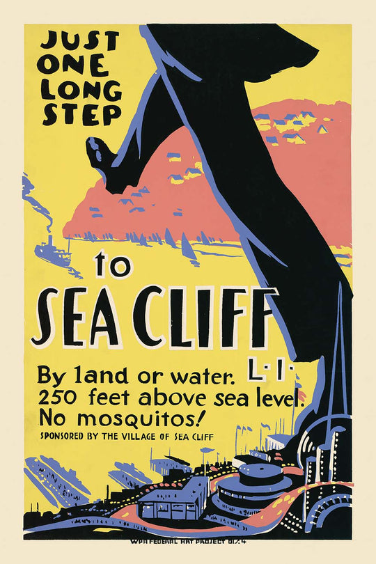 “Just one long step to Sea Cliff,” created in 1936 by an anonymous Art Deco poster artist, captures the breezy allure of Sea Cliff on Long Island’s North Shore. In the confident visual language of the 1930s, the poster invites city dwellers to an elevated coastal retreat—literally and figuratively—proclaiming Sea Cliff as “250 feet above sea level.” With its streamlined figure, bold lettering, and sun-splashed palette, this piece distills the optimism of interwar American travel culture and the easy escape from New York City to a village famed for its high bluffs, salt air, and harbor views.