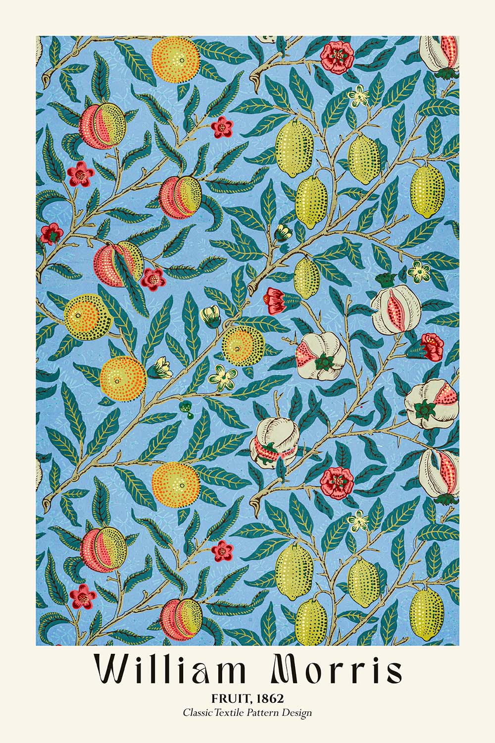 William Morris—designer, poet, publisher, and social thinker—founded Morris & Co. and spearheaded the Arts & Crafts movement, championing handcraft and the unity of art and everyday life. His wallpapers and textiles set a new standard for pattern design, marrying medieval inspiration and natural observation with superb technical discipline. Fruit stands among the motifs that helped define this vision: cultivated, humane, and endlessly livable.