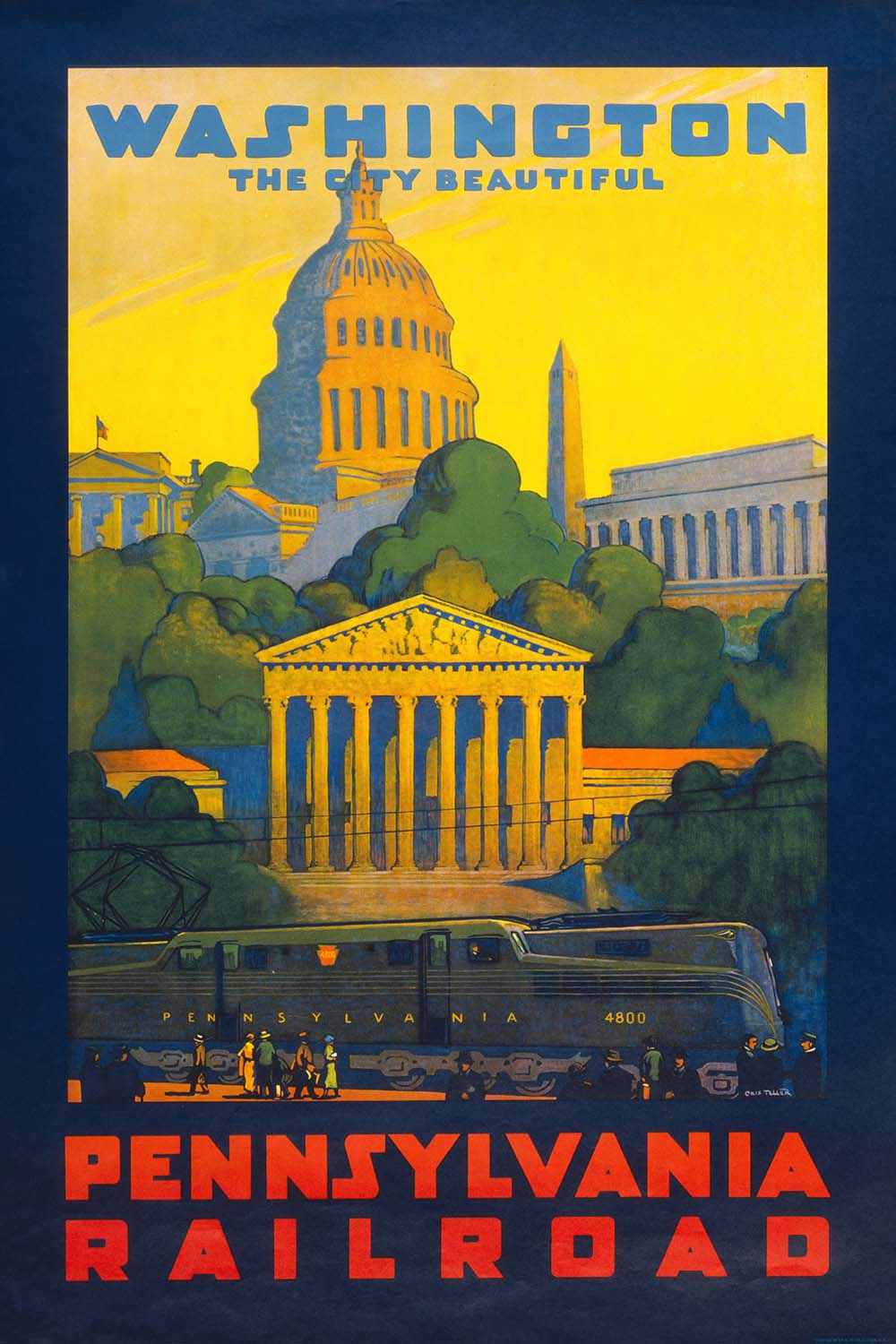 Why this subject matters: Washington, D.C. was—and remains—a quintessential destination for American travelers, and in 1940 the Pennsylvania Railroad made reaching the capital both efficient and glamorous. This poster acknowledges the city’s “City Beautiful” planning legacy by spotlighting its axial grandeur: the Capitol’s commanding dome, the dignified mass of the Lincoln Memorial, and the sweep of green that ties the monuments together. It evokes national pride and the romance of arrival at Union Station, where civic spectacle meets the energy of modern transport.