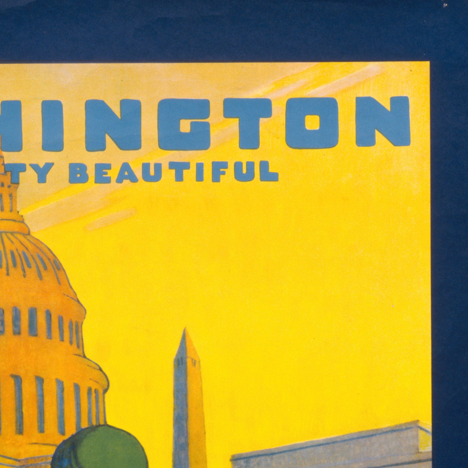 Style and color to love: Teller works in a high Art Deco idiom—crisp geometry, clean silhouettes, and purposeful lines—tempered by warm, inviting color. A dominant yellow glow gives the city an almost ceremonial aura, offset by deep, confident blues in the sky and structural shadows, with fresh greens suggesting the Mall’s open expanses. Bold typography anchors the composition and underscores its promotional verve. This palette flatters a wide range of interiors, from mid-century and industrial to contemporary spaces, pairing beautifully with walnut, brass, black metal, or white oak.