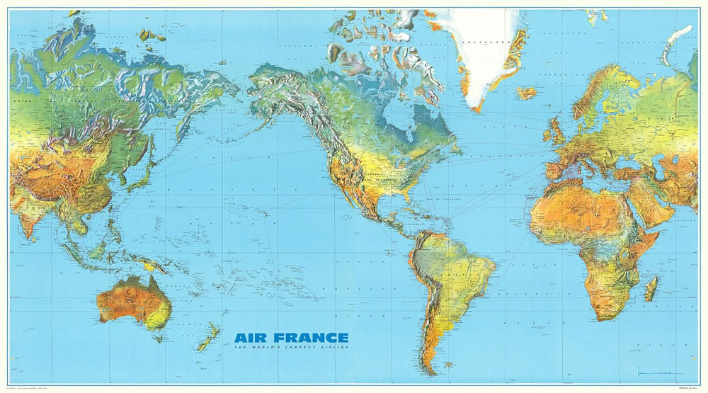 Grande carte du monde des routes d'Air France, 1961: Lumineuse et moderne, zones climatiques, topographie