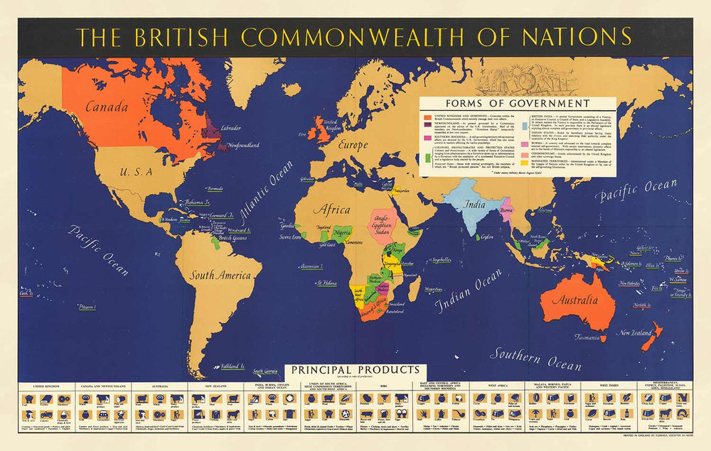 La carte montre tous les "produits principaux" produits ou fabriqués par chacun des pays du Commonwealth, tels que les machines et le sucre en Australie, du café et du tabac en Afrique de l'Est.