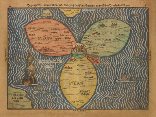 La structure en trèfle de la carte entoure élégamment les continents de l'Europe, de l'Afrique et de l'Asie, tandis que des régions comme l'Angleterre, la Scandinavie et l'Amérique sont représentées en dehors de ces cercles principaux. Ce choix de design souligne la centralité de la Terre Sainte, suivant le modèle T-O couramment utilisé dans les cartes médiévales. L'œuvre de Bunting se distingue par son approche innovante, fusionnant les perspectives théologiques avec la représentation géographique, en faisant un artefact significatif de l'ère de l'exploration. Chaque continent est minutieusement détaillé, reflétant la connaissance géographique et la signification religieuse attribuées à ces terres durant le temps de Bunting.