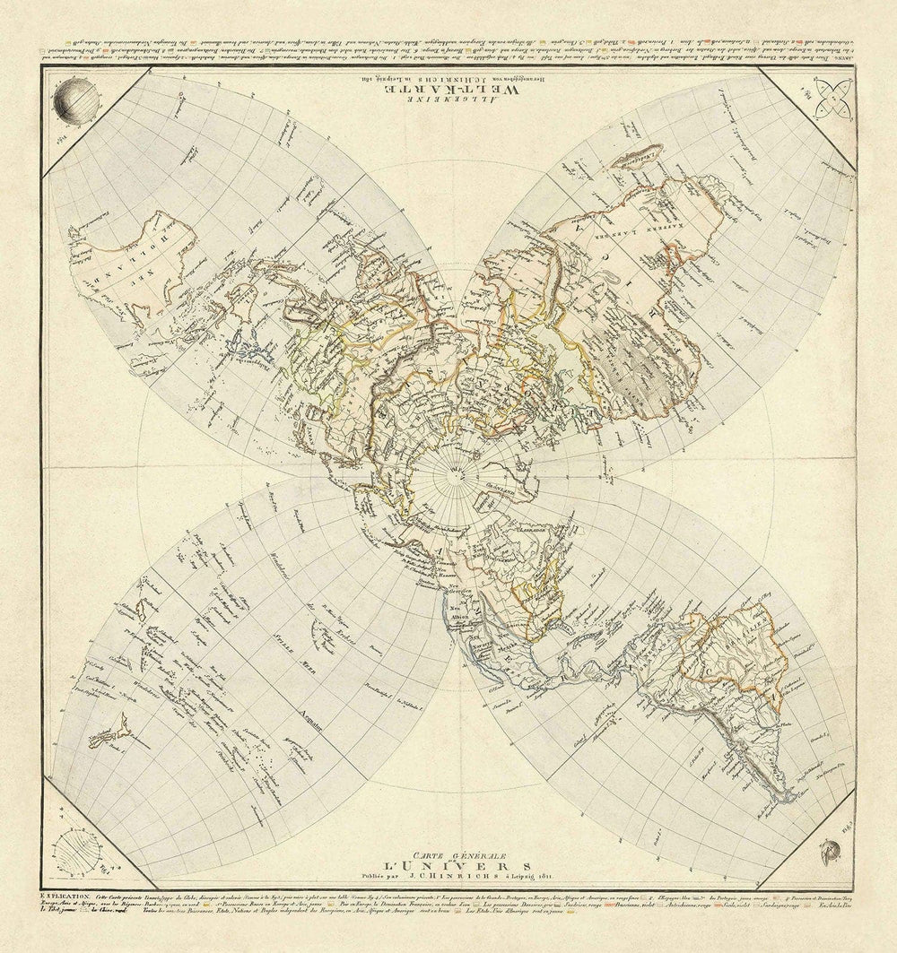 Une carte du monde 'terre plate' hautement attrayante, inhabituelle et rare publiée par le cartographe allemand Johann Conrad Hinrichs en 1811. Techniquement, cette carte utilise une projection azimutale stéréographique - ce qui signifie essentiellement que vous regardez d'en haut du pôle nord et qu'elle est divisée en quatre 'lobes'.