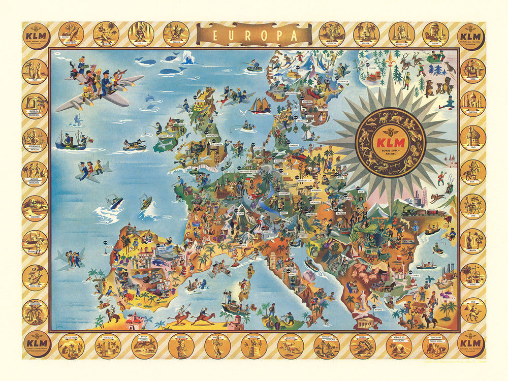 KLM, connue pour son vaste réseau et son importance historique dans l'industrie aéronautique, a commandé cette carte pour mettre en valeur l'attrait des destinations européennes. La carte sert à la fois d'outil promotionnel et d'artefact culturel, reflétant l'engagement de la compagnie aérienne à connecter les voyageurs avec les diverses cultures d'Europe. La bordure décorative, ornée d'images de villes du monde entier, souligne encore davantage la portée mondiale et l'esprit cosmopolite de KLM.