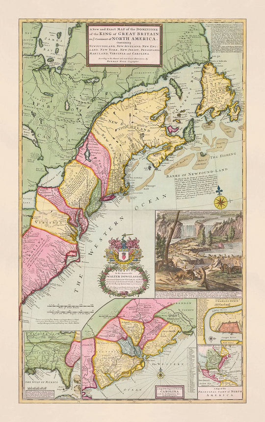 Ancienne carte de l'Amérique du Nord 1715 par Herman Moll: Nouvelle-Angleterre, Nouvelle Écosse, New York, Caroline, Français et treize Colonies britanniques
