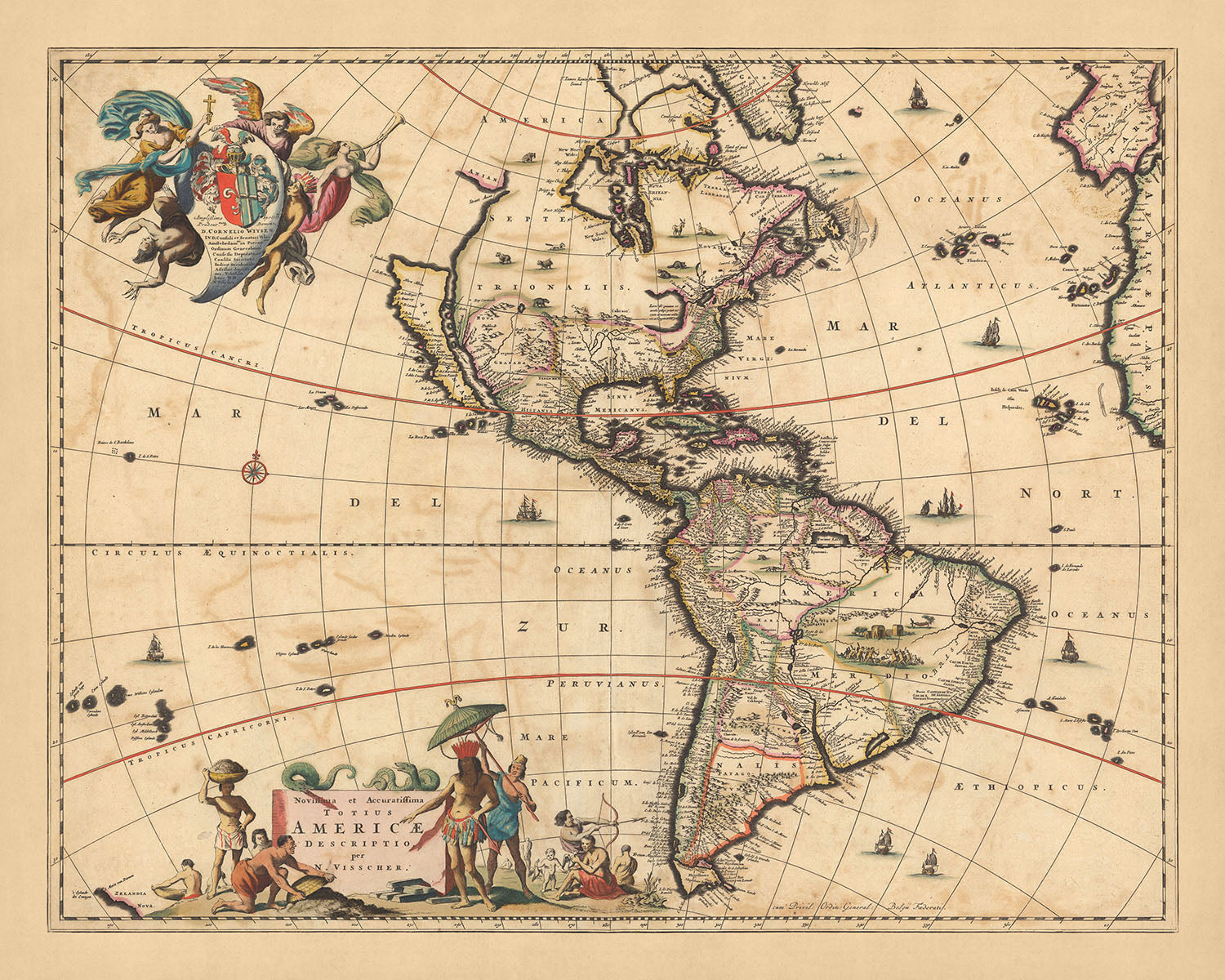 Ancienne carte des Amériques par Visscher, 1690 : Amérique centrale, Caraïbes, Polynésie, îles de l'Atlantique, forêt amazonienne