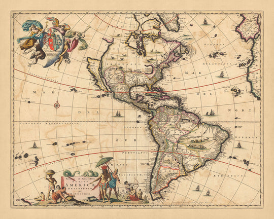 Découvrez la riche tapisserie des Amériques vue à travers les yeux du cartographe néerlandais Nicolaes Visscher II en 1690. Notre offre, la « Novissima et accuratissima totius Ameriae », ou « La carte la plus récente et la plus précise de l'ensemble de l'Amérique », est une illustration époustouflante de l’Amérique du Nord et de l’Amérique du Sud. Cette carte, méticuleusement réalisée par Visscher, petit-fils de Claes Janszoon Visscher, cartographe renommé du Siècle d'or néerlandais, offre une perspective unique sur les divisions politiques et géographiques de l'époque.