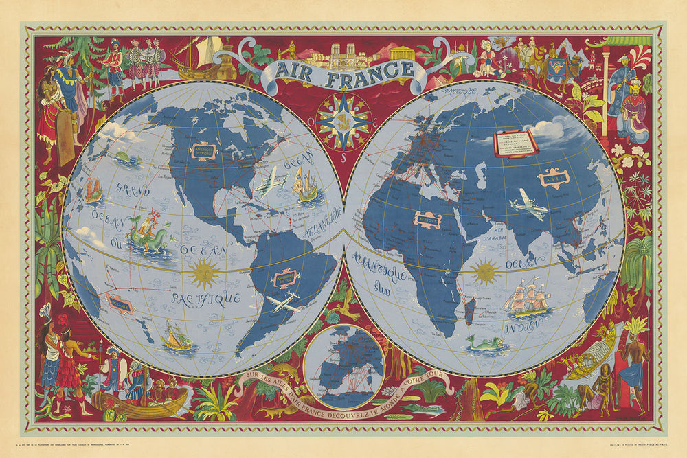 Cette carte n'est pas seulement un plaisir visuel mais aussi une riche source de contexte historique. Il capture l'essence du milieu du XXe siècle, une époque où le transport aérien devenait de plus en plus accessible et où Air France était à l'avant-garde de cette révolution. Le cartographe Lucien Boucher a apporté à cette pièce sa vision artistique unique, mêlant précision cartographique et illustrations imaginatives. Son expérience dans le surréalisme et son expérience en matière de conception pour Air France sont évidentes dans le design captivant de la carte.