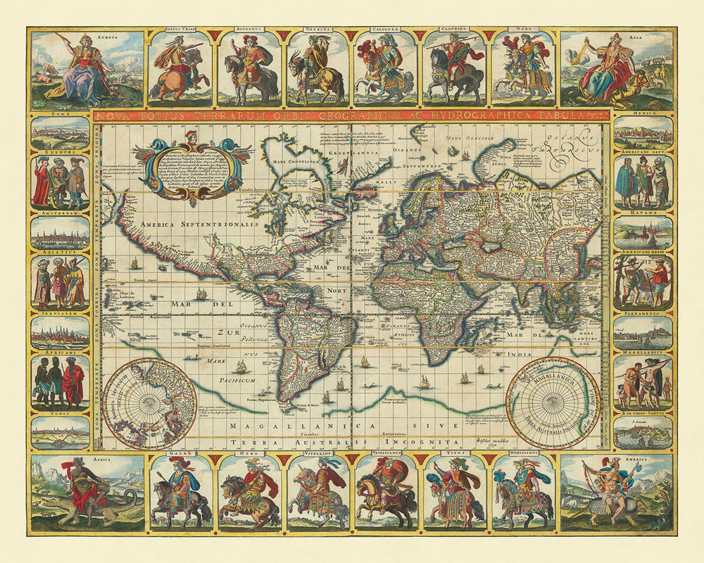 Le design et le style de la carte sont un festin pour les yeux, caractérisés par son gravure en couleur à la main qui donne vie au paysage politique du 17ème siècle. La Nova Totius Terrarum Orbis est ornée de bordures élaborées et de vignettes qui narrent le monde au-delà de la simple géographie. L'inclusion des Douze Césars, empereurs romains montés dans les bordures décoratives, infuse la carte d'un sens de profondeur historique et de grandeur. Ces empereurs, chacun représenté dans des armures élaborées, servent de gardiens des connaissances du monde ancien, supervisant une carte qui est autant une déclaration politique qu'une représentation géographique.