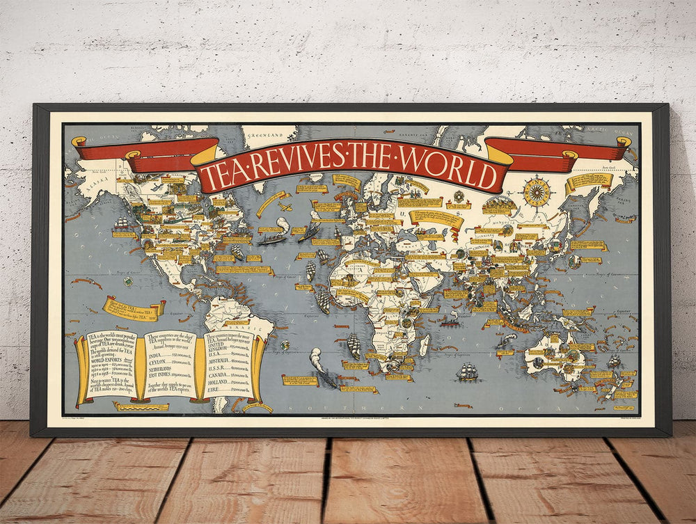 Ceci est une carte du monde magnifique et absolument unique qui parle... uniquement de THÉ ! Commandée par le Conseil International pour l'Expansion du Marché du Thé (oui, vraiment) et réalisée par le meilleur cartographe de l'époque, MacDonald Gill, cette carte de 1940 est probablement la plus grande carte ancienne liée au thé que vous trouverez jamais.