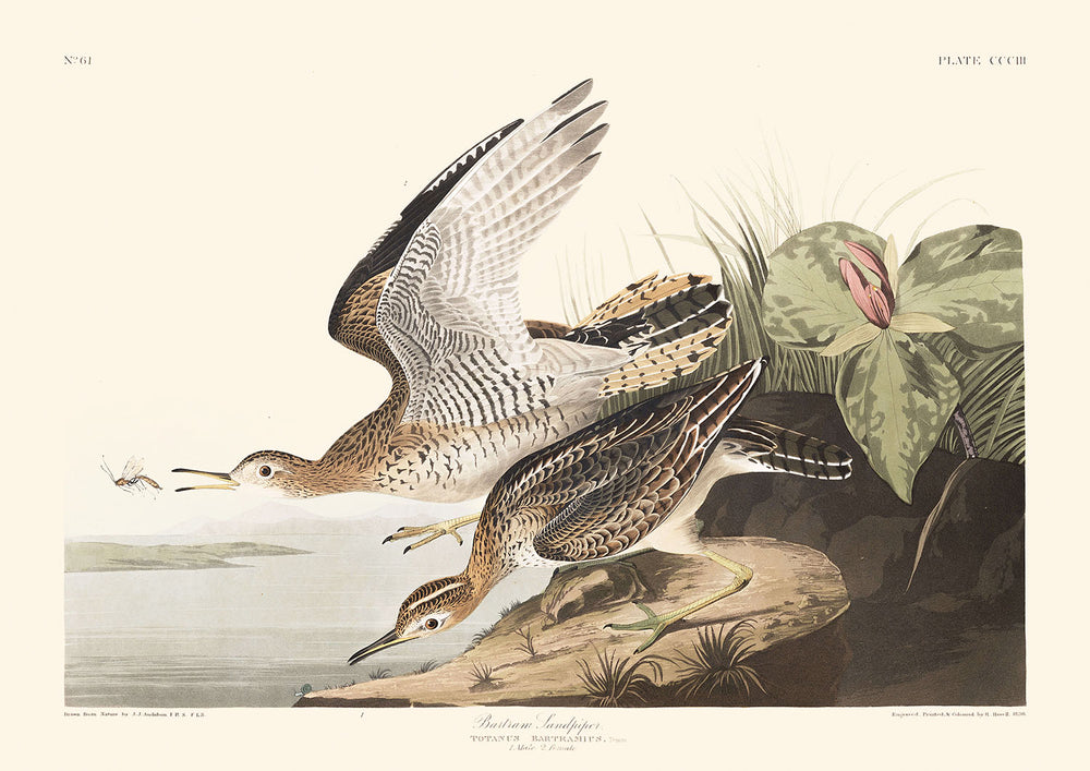 L'impression du Bartram Sandpiper se distingue par sa représentation précise de l'oiseau dans une pose naturelle, avec des détails exceptionnels dans le plumage et le paysage de fond. Cette illustration offre non seulement un attrait esthétique mais aussi un aperçu du comportement et de l'habitat de l'oiseau. L'utilisation méticuleuse de la couleur et l'expression réaliste de l'oiseau en font un sujet fascinant pour tout amateur d'art ou d'oiseaux.