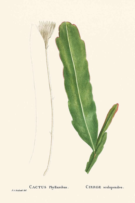 Présentation de « Cactus grimpant » du célèbre illustrateur botanique Pierre-Joseph Redouté, méticuleusement réalisé en 1802. Cet exemple exquis d'illustration botanique victorienne capture la beauté naturelle du cactus Phyllanthus, également connu sous le nom de cactus grimpant. Redouté, né en Belgique, est devenu célèbre pour sa remarquable capacité à représenter des sujets botaniques avec précision et grâce, ce qui lui a valu une reconnaissance importante dans l'histoire de l'art.