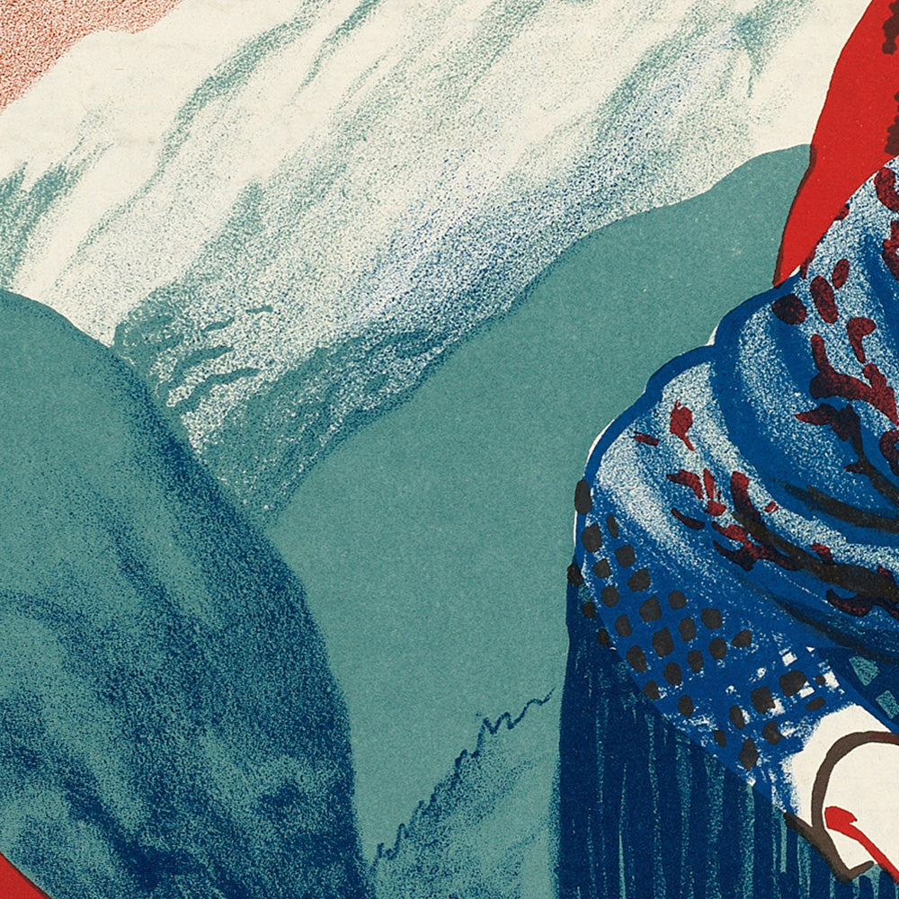 About the style and color: Colas organizes the composition with bold planes of color—deep blues and teals for the hills, warm brown framing, and accents of vivid red that spark against the cool background. The long fringes of the woman’s shawl create a rhythmic vertical texture, while the pale sky and snow-swept peaks open the scene with airy negative space. The typography, clean and monumental in off-white, balances the graphic figures and gives the poster its classic Art Deco poise. As wall art, it brings a sophisticated alpine palette—blue, red, and earthy neutrals—into both contemporary and traditional interiors.