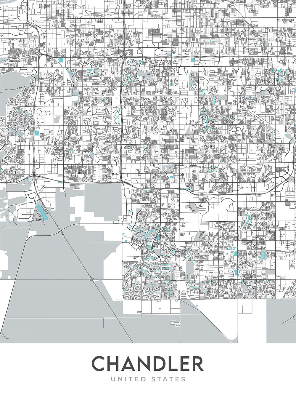 Cette carte de Chandler, Arizona est un plan de rue moderne et détaillé sans étiquettes. La carte couvre une zone rectangulaire d'environ 16 milles de haut sur 13,4 milles de large, le centre de la carte étant situé aux coordonnées exactes 33.29806N, -111.85936W. La carte se concentre sur la ville de Chandler et ses environs, y compris des parties de Tempe, Mesa et Gilbert. Certains des quartiers notables couverts par la carte incluent Downtown Chandler, Ocotillo, Sun Groves, Nozomi Park, Hamilton Park, McCullough-Price, Galveston, Hidden Valley, Sun Lakes, Quail Creek, Fulton Ranch, Cooper Commons, Lindsey Farms, McQueen Park. , Desert Wells, San Marcos, Boulder Creek, Sunset Lakes et les îles.