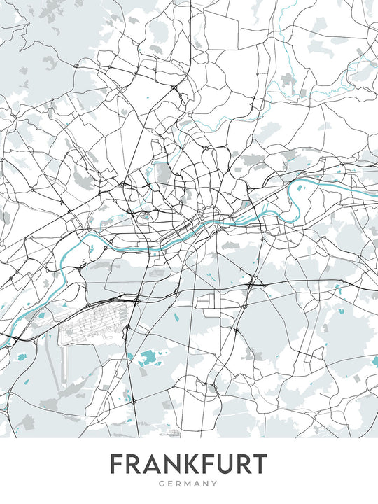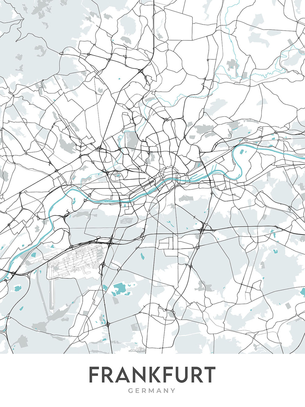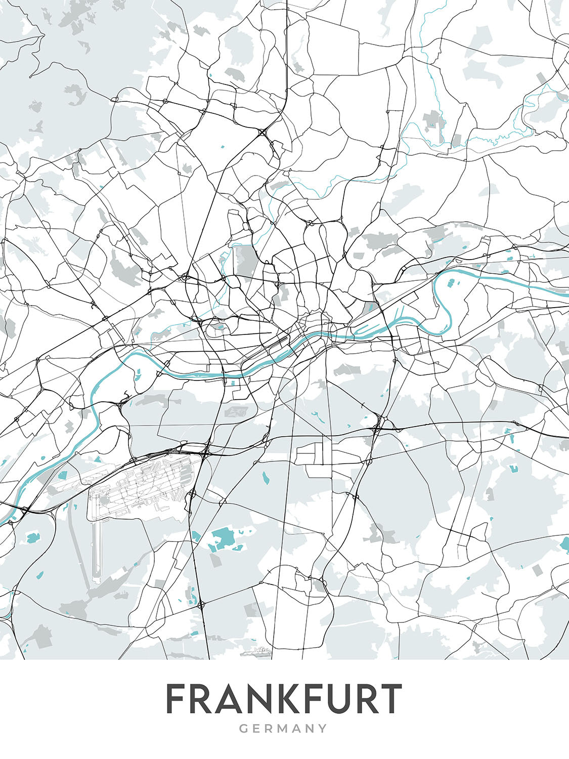 Cette carte de Francfort, en Allemagne, est une merveille moderne de cartographie et de design. Il s'agit d'un plan détaillé des rues de la ville, mettant l'accent sur le réseau complexe de routes et de rues qui composent cette métropole animée. La carte couvre une grande partie de la ville, y compris plusieurs de ses quartiers et monuments les plus célèbres.