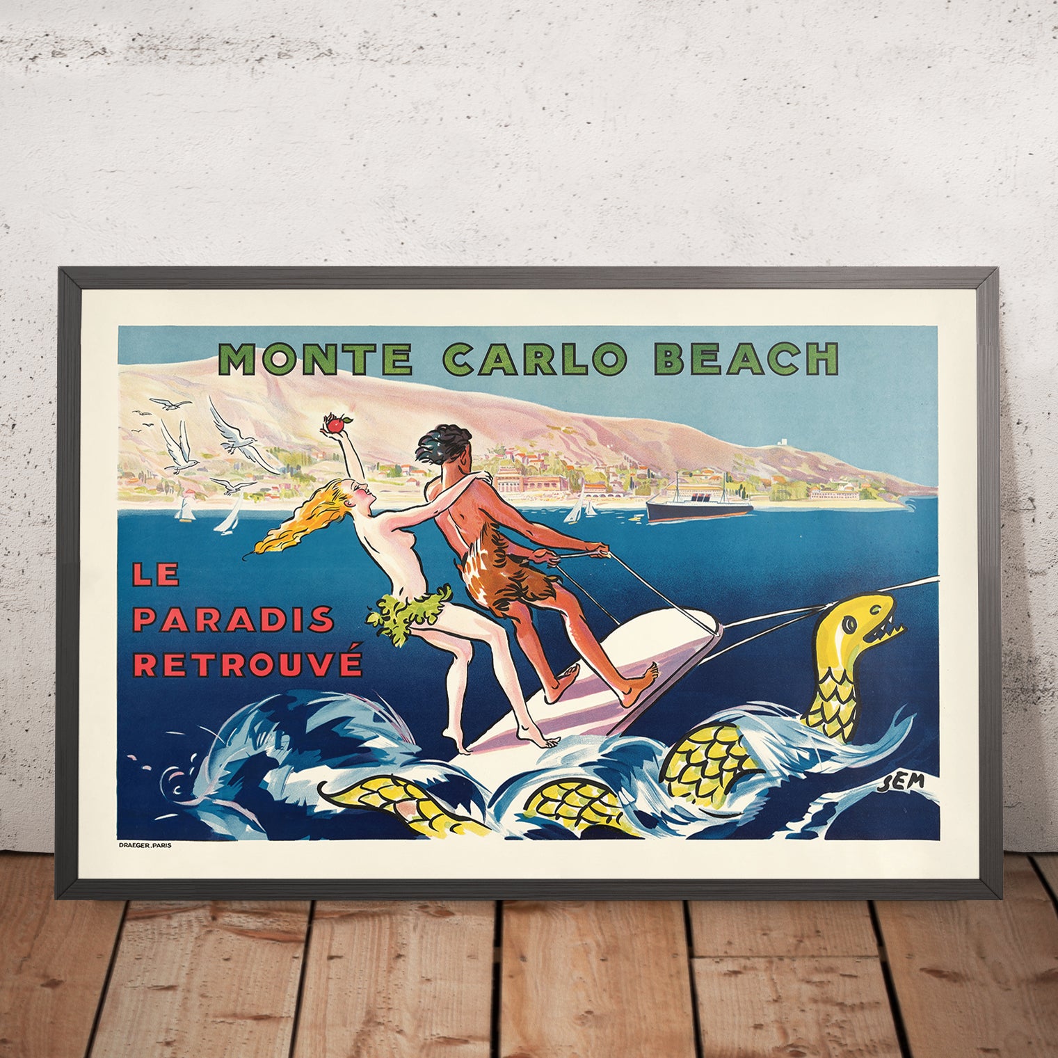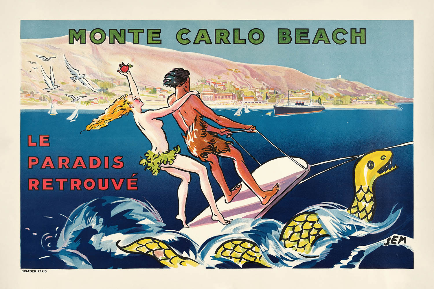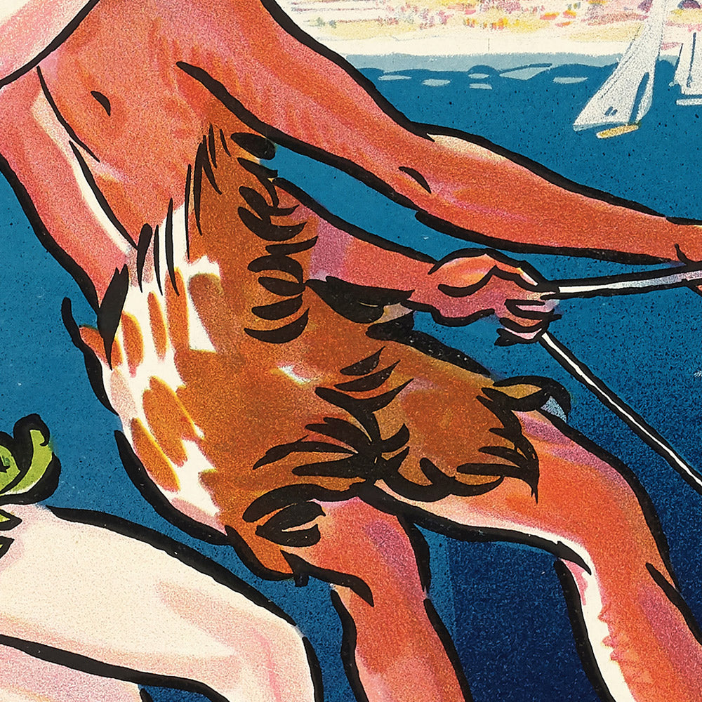 Monte Carlo Beach by Georges Goursat—better known as Sem—captures the Riviera at its most dazzling. A star of the Belle Époque who segued effortlessly into the streamlined glamour of the Art Deco age, Sem distilled the sunlit hedonism of Monte Carlo into a poster that feels both playful and impossibly chic. Here, elongated figures bask in seaside adventure against a jewel-toned Mediterranean, while a sinuous, decorative sea creature coils through stylized waves—a witty, mythical flourish that heightens the sense of escapist luxury for which this coast is famed.