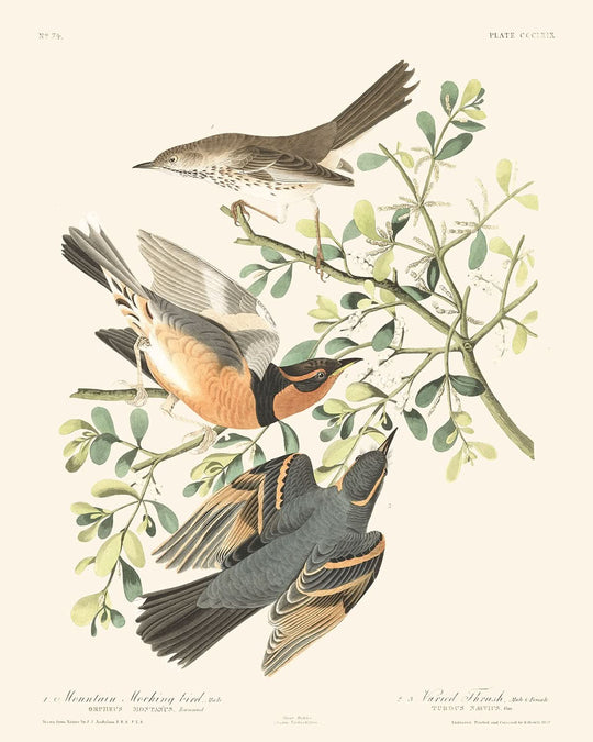 Cette œuvre est remarquable pour sa représentation du Moqueur des montagnes et de la Grive variée, offrant un aperçu fascinant de ces espèces et de leurs comportements. Trouvé notamment dans les plaines plus fraîches des montagnes Rocheuses, le Moqueur des montagnes, décrit scientifiquement comme Turdus montanus, et observé avec célébrité par des chercheurs comme M. Townsend, est célébré pour sa chanson mélodieuse et sa présence frappante. L'illustration encapsule parfaitement ces éléments, en faisant un incontournable pour les passionnés d'oiseaux et les collectionneurs d'art.